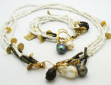 Beautiful white ocean pearls and natural Citrine combine with Italian gold-filled chain and findings to make a luminous and sumptuous modern bracelet. Ocean pearls are thought to access the mystical feminine and Goddess energies; protective Citrine is believed to assist with life transitions, success, abundance, new partnerships, mental clarity, creativity, confidence, truth, will, spirituality and joy. Matching necklace includes an equally brilliant blend of South Seas white pearls, Natural Citrine nuggets, natural Pyrite beads, and Italian gold filled chains, pins and hook, and natural Pyrite beads. Attach your own pendant, or choose ours of gorgeous Natural Amber. Amber, sometimes called “the stone of optimism,” is Nature’s own jewel made of fossilized tree resin. Amber is said to enhance creativity and self-confidence, and to open up spiritual wisdom and manifestation of dreams. Historically it has been associated with fertility and the universal life-force. |