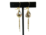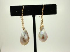 These gold pink pearl earrings emphasize classical elements such as simplicity, balance, natural form, clarity and nobility. Surrounded by 24K Gold fill with natural multiful gold, these pink pearls exude elegance.