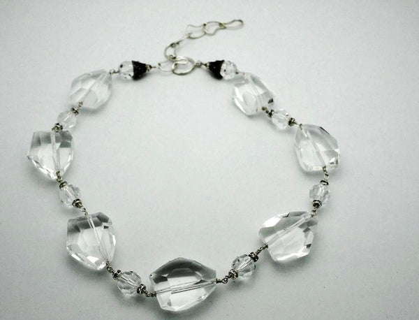 Gorgeous large multi-faceted Quartz crystal nuggets alternate between large and smaller sizes for a balanced effect; a length of handcrafted silver chain cascades down at the closing, elegantly highlighting the sleek line of your upper back.  This stunning and classic crystal necklace  looks equally great with formal, office, or casual wear.   Clear quartz crystal is thought to help clear spaces, enhance meditation, and transform unwanted energies to all that you wish to attract; recharge crystal’s powerful energies by placing it in direct sunlight outdoors for a few days.